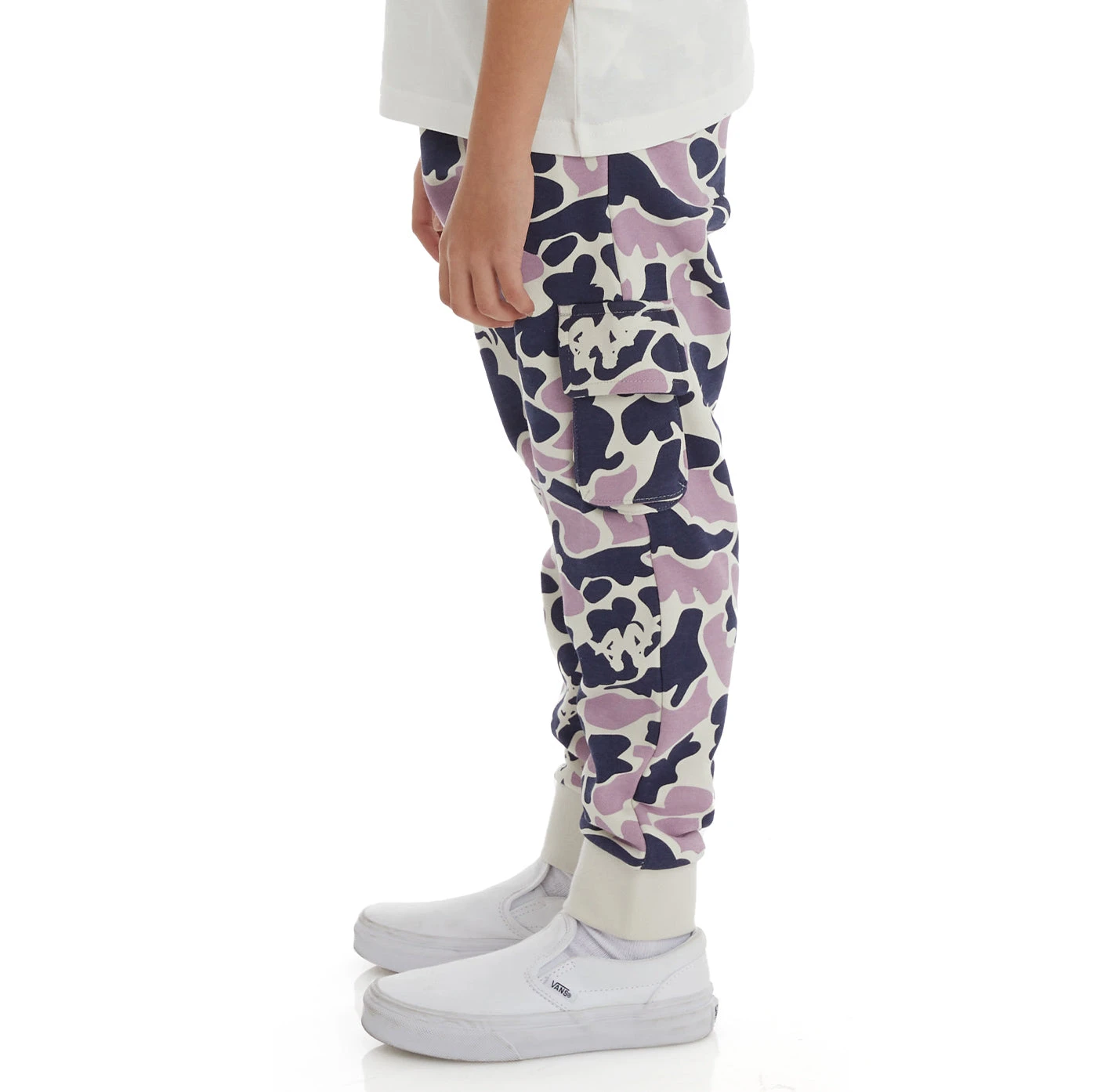 Kids cargo pant in french terry. REGULAR FIT. Pockets on front and welt pockets on back. Logo printed on front, all over print. Textile Composition: Cotton 80% – Polyester 20%