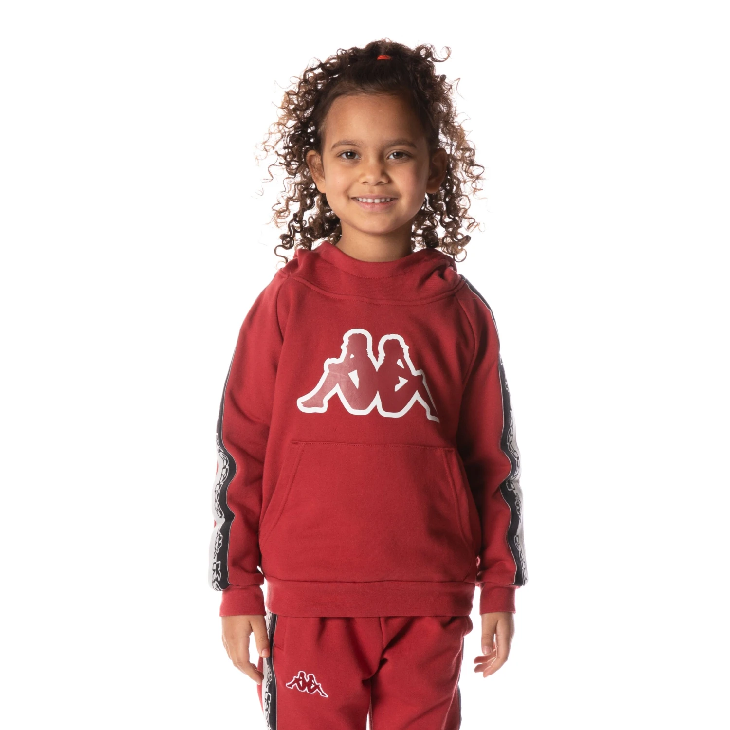 Kids hooded jumper made with brushed fleece. REGULAR FIT. Long sleeve, hooded and central pocket. Logo Tape applied on the sleeves. Omini Logo printed on the chest. Textile Composition: Cotton 80% – Polyester 20%